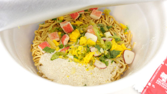 3分後、フタを開けて調味油を投入。調味油はコーンスープのような黄色でした。