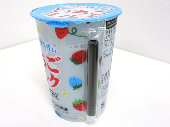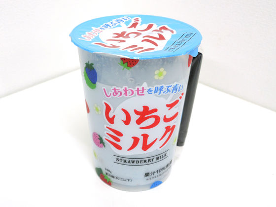 中身はこんな感じ。およそいちごミルクとは思えない薄青色が特徴。ただ、青いだけで中身は普通のいちごミルクでした。脱脂粉乳の甘さが早めに引いて砂糖の甘さが残るような味わいです。いちごの風味はやや弱め。いちごの果肉が入っているので味わいに変化が生まれます。