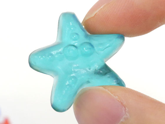 いろいろな形をした青いグミがいくつか入っていました。若干の清涼感と、りんごのようなブルーベリーのような少しの酸味を感じられるグミです。