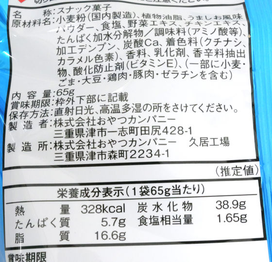 外側が塩気のある味わいで、かんでいるうちに中からも塩味の何かが染み出してくるような感覚があります。原材料には魚介類のパウダーが複数使われているはずですが、シーフード成分はあまり感じられず。