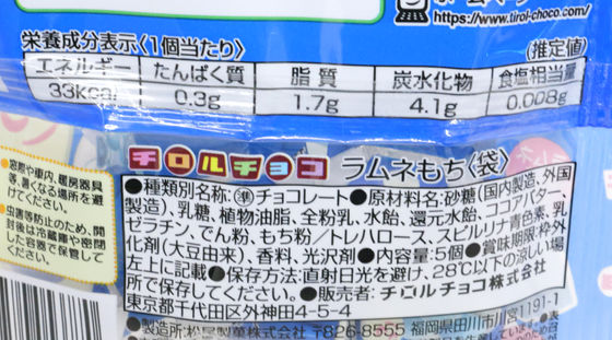 カロリーは1個あたり33kcal。原材料は水飴やココアバター、でん粉などです。