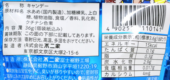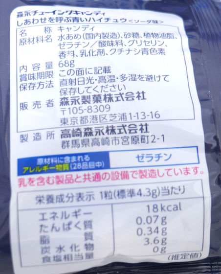 原材料は水あめや香料、クチナシ青色素など。カロリーは1粒あたり18kcalです。