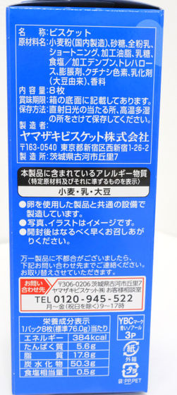 原材料は小麦粉やショートニング、クチナシ色素など。カロリーは1パック8枚当たり384kcalです。