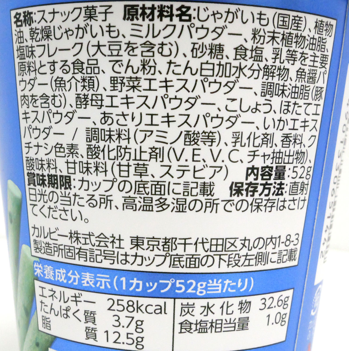 原材料はじゃがいも、魚醤パウダー、野菜エキスパウダー、ほたてエキスパウダーなど。カロリーは258kcalです。