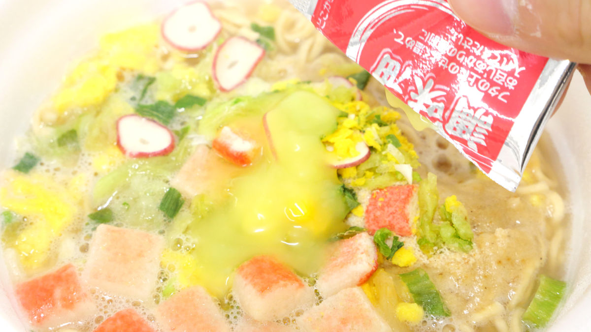 3分後、フタを開けて調味油を投入。調味油はコーンスープのような黄色でした。