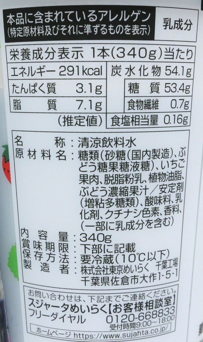カロリーは291kcalで、原材料はぶどう糖果糖液糖、いちご果肉など。