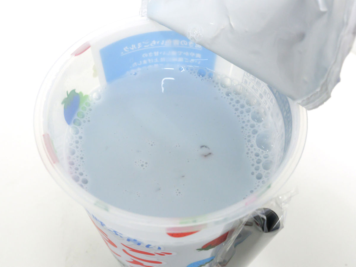 中身はこんな感じ。およそいちごミルクとは思えない薄青色が特徴。ただ、青いだけで中身は普通のいちごミルクでした。脱脂粉乳の甘さが早めに引いて砂糖の甘さが残るような味わいです。いちごの風味はやや弱め。いちごの果肉が入っているので味わいに変化が生まれます。