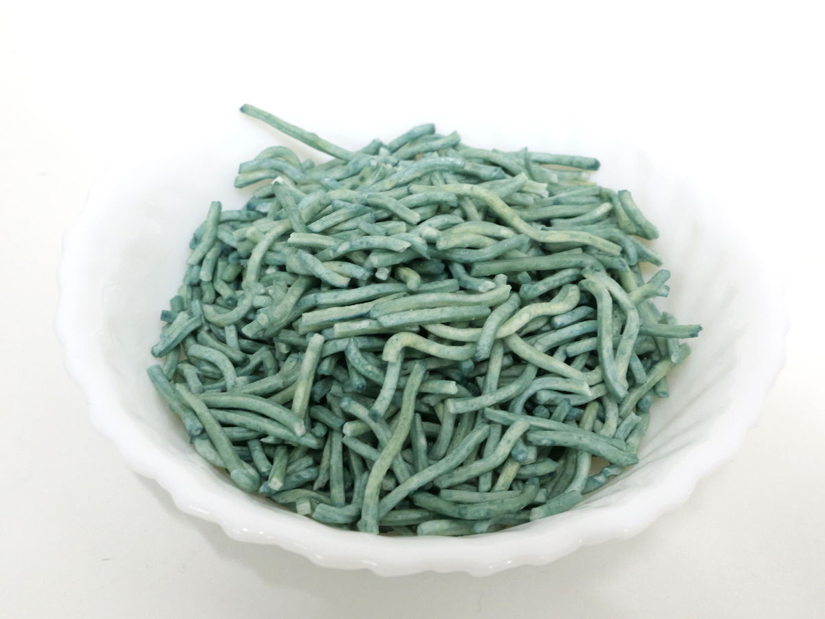 味は普通のベビースターラーメンですが、見た目はやや緑がかった青色。塩とチキンエキスの濃い味、野菜エキスの香り、サクッと砕ける食感が楽しい味わいで、ほんのわずかにピリ辛です。「青さ」にちなんだ味の特徴はないようです。