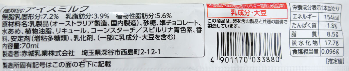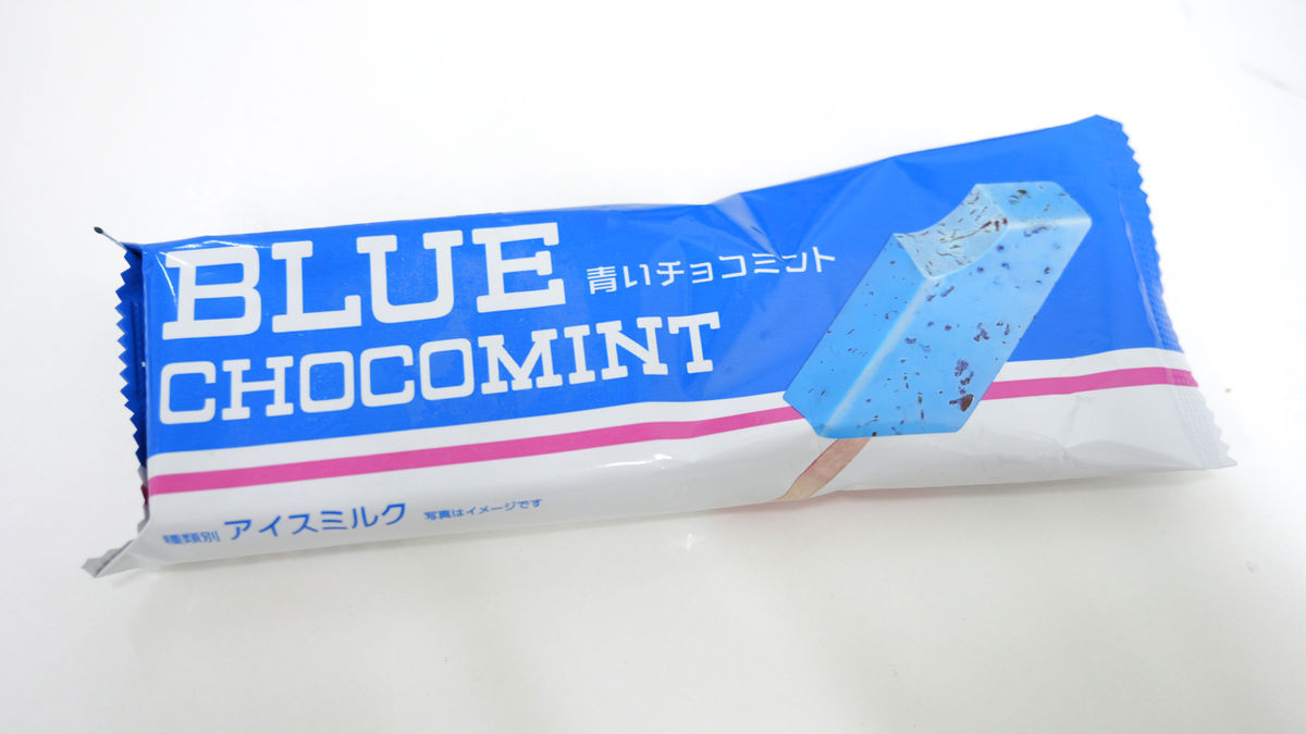 最後はアイスの「青いチョコミント」。パッケージはローソンの看板のようなデザインです。