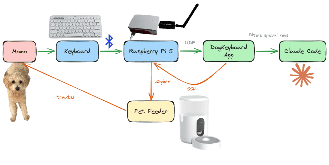 システムはモモがBluetoothキーボードで入力した信号をRaspberry Pi 5経由でDogKeyboardというRust製アプリに送り、特殊キーをフィルタリングした後にClaude Codeへ渡す構成。