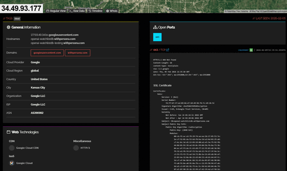 celesteさんはインターネットに接続されたIoT機器やサーバーなどを検索できるShodan Search Engineを使い、Personaが使用している「34.49.93.177」というIPアドレスを検索したそうです。すると、以下のような文字列が見つかりました。「openai(OpenAI)」と、データベースを意味する「watchlistdb」という文字列が含まれています。