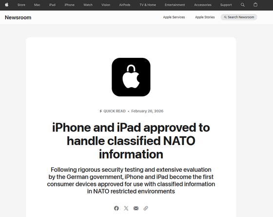 2026年2月26日にiPhoneとiPadがドイツ政府のセキュリティテストに合格し、民生用デバイスとして初めて「NATOの機密情報を扱えるデバイス」に認定されたことが明らかになりました。