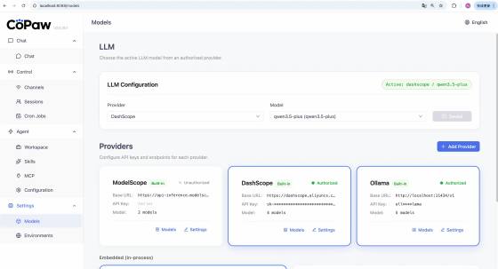 以下はCoPawのモデル管理画面です。基本的にローカルAIモデルを使うように設計されており、Ollamaやllama.cppを介して好みのAIモデルを実行できます。さらに、DashScopeやModelScopeのAPIを介してクラウドAIモデルを実行することもできます。