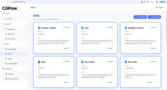 CoPawはMCPサーバーにも対応しており、外部アプリとの連携が可能。加えて、ClawHubに登録されているスキルを実行することもできます。AIモデルやMCPサーバー、スキルを自由に組み合わせることで、自分専用のAIアシスタントを作り出せるというわけです。