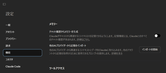なお、Claudeのメモリ機能およびメモリインポート機能は「設定」内にある「機能」タブから利用可能です。