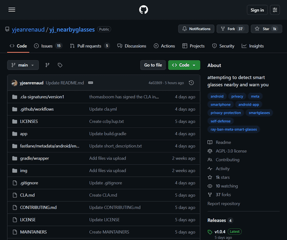 ジャンルノー氏はNearby GlassesをAGPL 3.0で配布しており、GitHub上でソースコードも公開しています。ジャンルノー氏はNearby Glassesについて、「Bluetoothデータに含まれる企業識別子を利用するため誤検知が発生する可能性があります」と警告しており、具体的にはMetaのVRヘッドセットをMeta製スマートグラスと誤検知してしまうケースがあると説明しました。