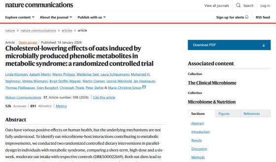 オートミールはエンバク(オート麦)を調理しやすく加工したシリアルのことで、食物繊維・ビタミン・ミネラルなどが豊富な上にカロリーも低いため、近年は健康食品として注目されています。新たな実験では、2日間にわたりオートミール中心の食生活を続けるとコレステロール値が改善し、その効果が数週間続くという結果が示されました。