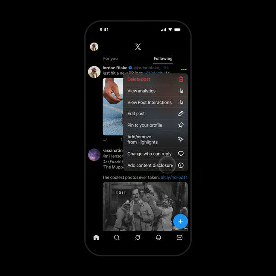 投稿メニューから「Add content disclosure(情報開示を追加)」をタップ。