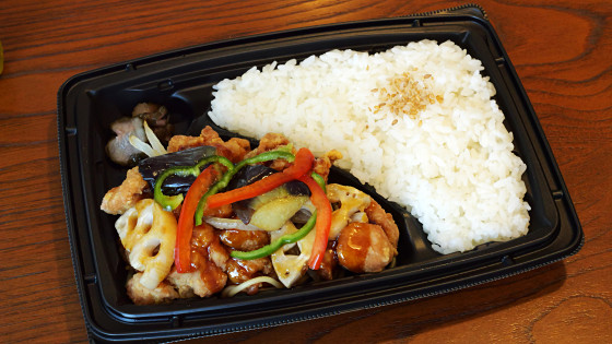 鶏の黒酢あんかけは鶏の竜田揚げと野菜に黒酢あんをかけたものです。野菜はなす、たまねぎ、れんこん、ピーマン、パプリカの5種類が入っています。