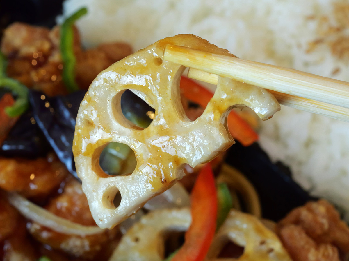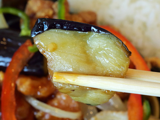 茄子は油を吸ってこってりしています。担当者によると「素揚げというわけではないももの、油を通している」とのこと。こったりした味と黒酢あんが合います。