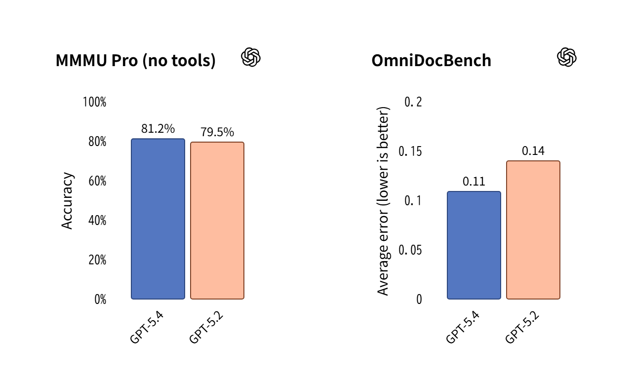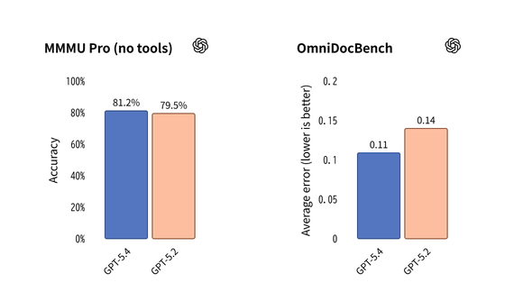 視覚的な理解と推論を測定するベンチマークであるMMMU-Proにおいて、GPT-5.4はツールを使用しない状態で81.2%の成功率を達成し、GPT-5.2の79.5%から確実な進歩を遂げました。OmniDocBenchでは、推論努力なしのGPT-5.4は平均誤差0.109を達成し、GPT-5.2の0.140から改善しました。これはフルフィデリティでの知覚をサポートする新しい画像入力レベルの導入によって支えられているとOpenAIはアピールしています。