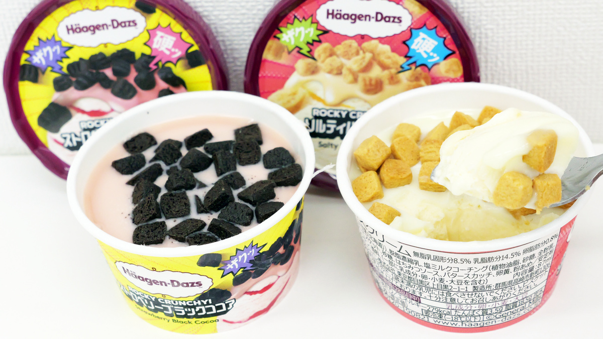 ハーゲンダッツのミニカップシリーズから、なめらかなアイスの上にザクザク硬いクッキーがトッピングされた「ROCKY CRUNCHY!ストロベリーブラックココア」「ROCKY CRUNCHY!ソルティハニーバター」が2026年3月10日に新登場します。発売に先駆けて編集部に届いたため、今までのハーゲンダッツとはひと味違ったアイスを味わってみました。