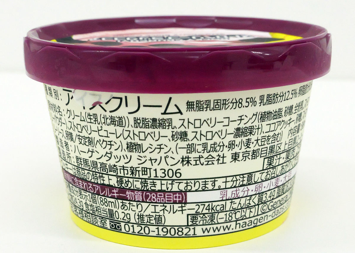 種類別はアイスクリームで、クリームのほかにストロベリーコーチングやストロベリーピューレが含まれています。カロリーは1個当たり274kcal。