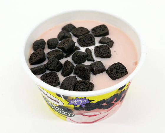 ROCKY CRUNCHY!ストロベリーブラックココアの見た目は以下のような感じ。ストロベリーアイスの上にゴロゴロサイズのココアクッキーがトッピングされています。