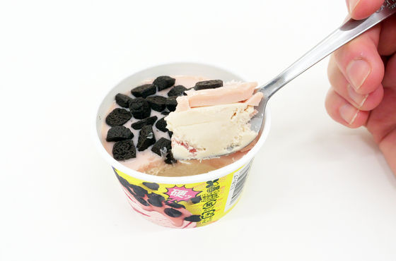 スプーンですくってみると、上部のストロベリーコーティングがパリッと割れました。一口食べると、滑らかなアイスにパリッとしたコーティング、そしてザクッと硬いクッキーと3種類の食感が楽しめます。アイス部分はクリーミーな甘さのアイスクリームに甘酸っぱいストロベリーソースとコーティング部分がアクセントになるほか、ココアクッキーにはカラメルも含まれてビターになっているため、ザクザクかむと味わいの変化も広がります。クッキーがそこそこ硬くてしっかりかむ必要があるためあっさり食べたい時には注意が必要ですが、食べごたえのあるスイーツを食べたい時にはかなりオススメです。