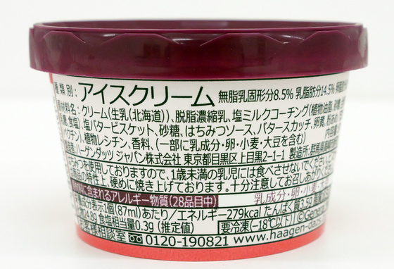 種類別はアイスクリームで、塩ミルクコーチングや塩バタービスケット、はちみつソースなどが含まれています。カロリーは279kcal。