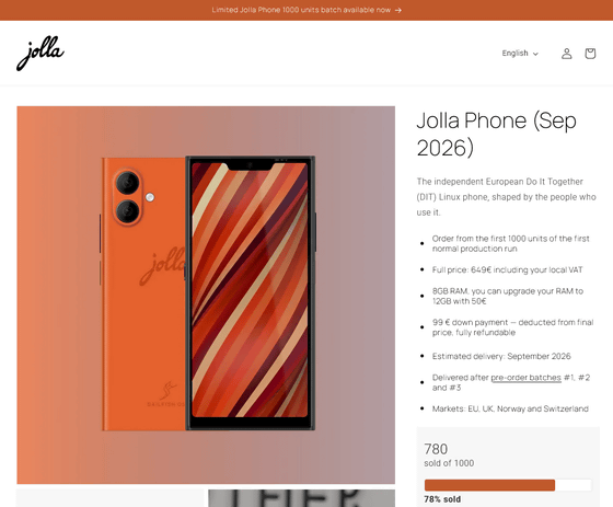 なお、Jollaは最初の予約に間に合わなかった人のために1000台限定で第2弾の予約受付も開始。頭金が99ユーロ(約1万8200円)で、残りは2026年9月の商品発送時の支払いになるとのこと。記事作成時点で、およそ780台が売約済みでした。