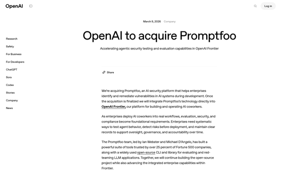 OpenAIが2024年創業で、フォーチュン500企業の25%以上が使っているというAIセキュリティスタートアップ「Promptfoo」の買収を発表しました。買収条件は発表されていません。