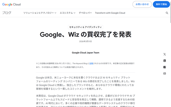 GoogleによるAIセキュリティプラットフォーム「Wiz」の買収が、2026年3月11日に完了したことが分かりました。買収計画はおよそ1年かけて進められていました。