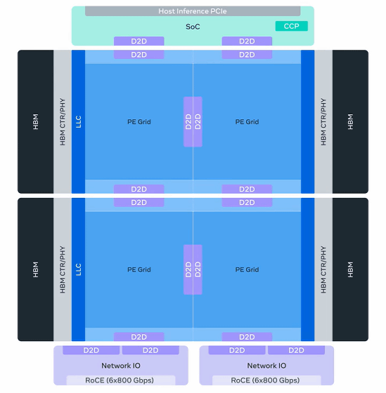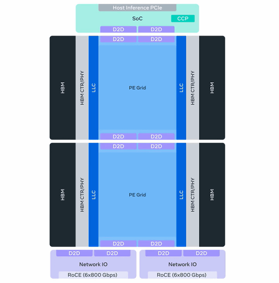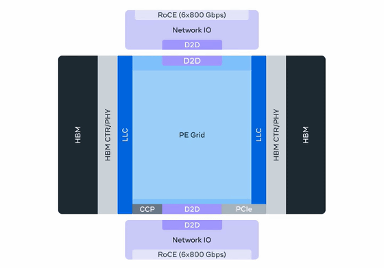 MTIA 300は「ranking and recommendation(R&R)」という手法でのAI学習に最適化されたチップでFP8精度での演算性能は1.2PFLOPsです。R&Rは生成AIより古い世代のワークロードとして位置付けられていますが、MTIA 300の設計は他のチップの基盤となったとのこと。MTIA 300は既に量産されています。