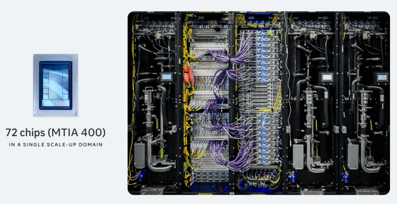 MTIA 400はラボテストが完了した段階で、データセンターへの導入に向けて準備が進んでいます。MetaはMTIA 400を72個搭載したラックの画像も公開しています。