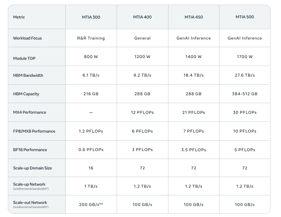 「MTIA 300」「MTIA 400」「MTIA 450」「MTIA 500」のスペックをまとめた表が以下。2027年までの2年間でMeta製チップの性能が飛躍的に上昇することが分かります。