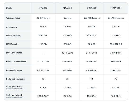 MTIA 500はHBM帯域幅を27.6MB/sに向上させたチップで、2027年に量産開始予定。演算性能はFP8精度で10PFLOPs、MX4精度で30PFLOPsです。