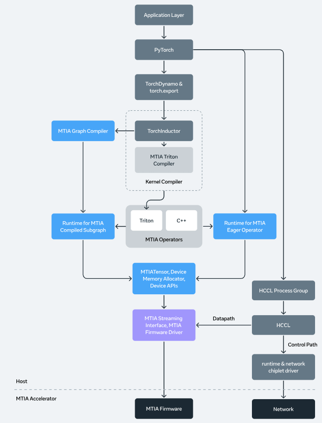 MTIAシリーズはPyTorchネイティブであることも特徴としており、開発者が使い慣れたエコシステムを維持できるとのこと。また、高頻度でのチップ開発と導入には大きなコストが伴いますが、4種のチップは同じラックやネットワークインフラストラクチャーを使うように設計されており、コストを相殺できるそうです。