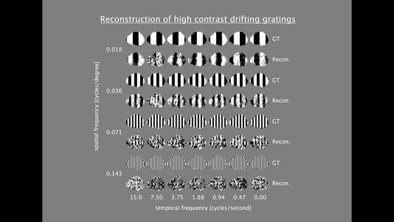 また以下は、画像の中で明暗や模様の細かさを表す「Spatial Frequency(空間周波数)」ごとに、1行目が元の映像、2行目がマウス1匹の予測ニューロン活動から再構成された映像。再構成された動画はマスクされており、コントラストや輝度のパターンが元の映像と高い一致率を示しています。
