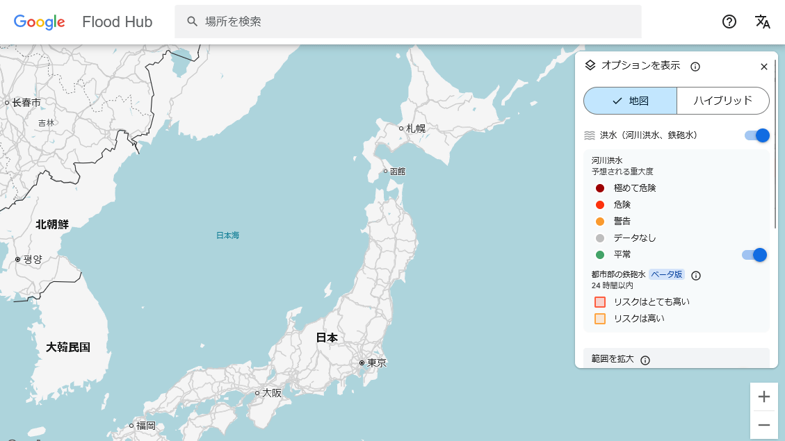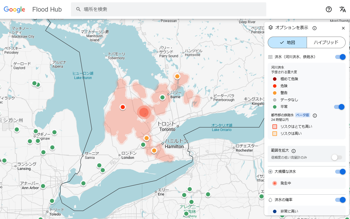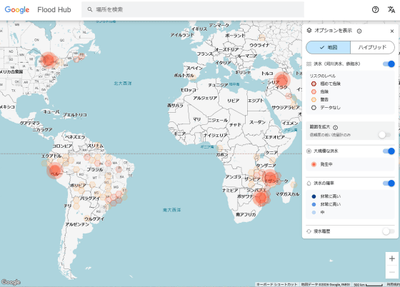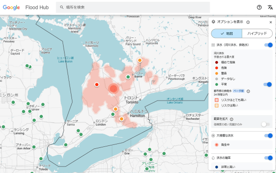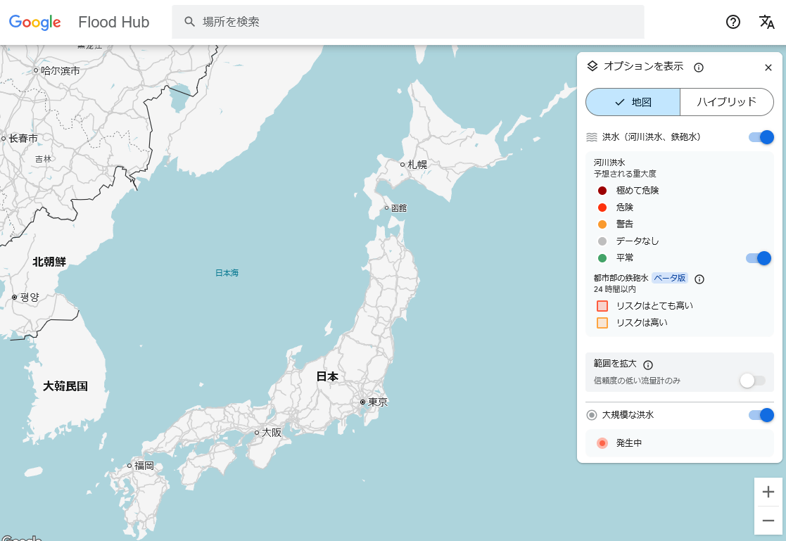 Googleは開発したAIを組み込んだ洪水予測マップ「Flood Hub」を以下のリンク先で公開しています。