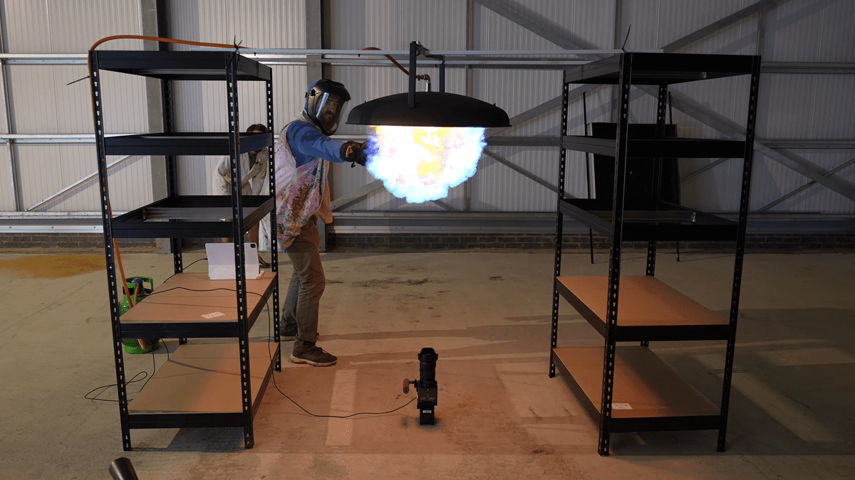 プロパンガスを通して着火。実際にスローモーションで見ていきます。