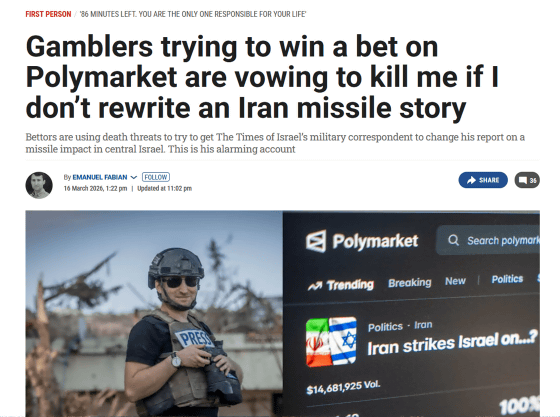 https://www.timesofisrael.com/gamblers-trying-to-win-a-bet-on-polymarket-are-vowing-to-kill-me-if-i-dont-rewrite-an-iran-missile-story/