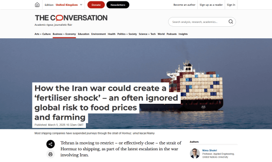 アメリカとイスラエルによる攻撃を受けているイランは、報復としてペルシア湾とオマーン湾の間にあるホルムズ海峡を封鎖しました。これにより国際エネルギー市場は混乱に陥っていますが、国際連合大学の応用工学教授であるニマ・ショクリ氏らは注目するべきはエネルギー問題だけでなく、世界中の家計や農業に大打撃を与える「肥料ショック」にも注目するべきだと警告しています。