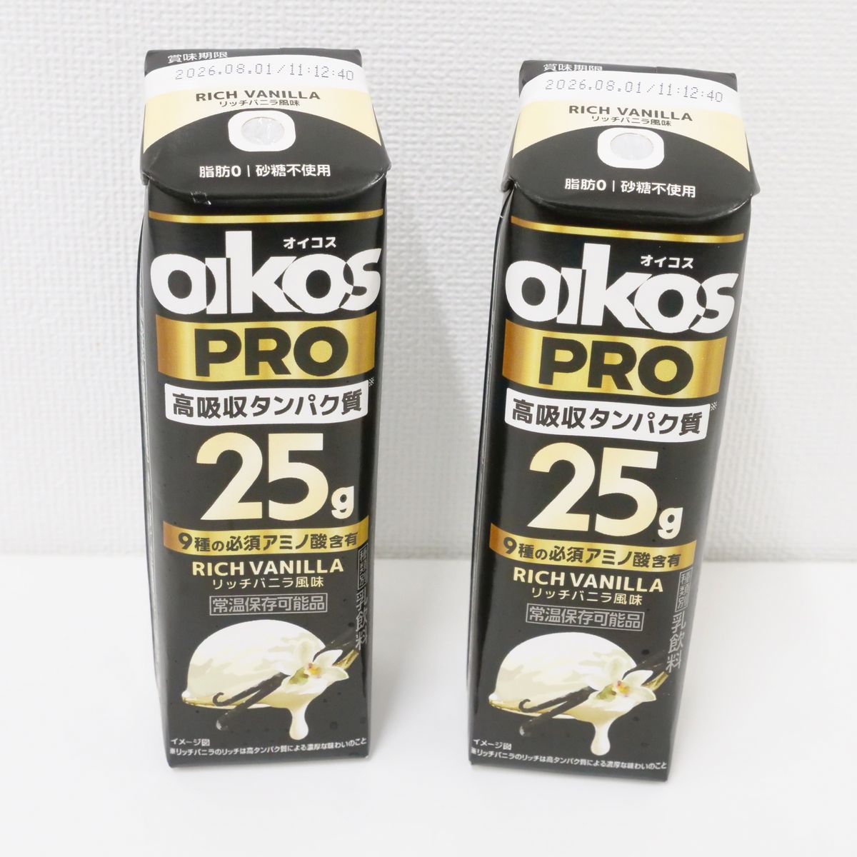「オイコス PROプロテインドリンク 高吸収タンパク質25g」(リッチバニラ風味)のパッケージはこんな感じ。