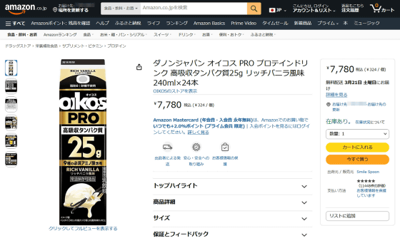 「オイコス PROプロテインドリンク 高吸収タンパク質25g」は2026年3月2日(月)から全国のコンビニエンスストアで、3月30日(月)からは全国のスーパーマーケットで入手可能。記事作成時点ではAmazon.co.jpでも購入可能で、価格は24本セットで7780円(1本あたり約324円)となっていました。