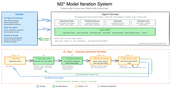 MiniMaxはMiniMax M2.7の製品版を開発するために「MiniMax M2.7の内部バージョン」に対して研究用エージェントハーネスの開発を指示しました。構築されたエージェントハーネスは「データパイプライン」「学習環境」「インフラストラクチャー」「チーム間コラボレーション」「永続メモリ」を管理可能で、「人間のAI研究者がAIモデルと会話しながら実験内容の設計やログ分析を行う」という開発フローを実現し、問題の発見と検証を高速化することに成功。製品版モデルの開発に際して、MiniMax M2.7はワークフローの30~50%を処理したそうです。