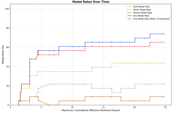 また、MiniMax M2.7の内部バージョンを用いてモデルを再帰的に進化させることにも成功しました。具体的には「問題の分析→修正計画→コードの変更→テスト実行→結果の比較→変更の適用もしくは破棄」という処理を100回以上繰り返すことで30%の性能向上を実現したとのこと。AIモデルをMiniMax M2.7を用いた再帰的進化システムでトレーニングし、数学オリンピックでのメダル獲得数の変化をグラフ化したものが以下。初期状態のAIモデルはメダルを1つも獲得できませんでしたが、再帰的進化システムを25時間実行することで平均メダル獲得率が66.6%にまで向上しました。