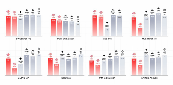 「MiniMax M2.7」「MiniMax M2.5」「Gemini 3.1 Pro」「Claude Sonnet 4.6」「Claude Opus 4.6」「GPT-5.4」の各種ベンチマーク結果は以下の通り。MiniMax M2.7はほとんどのテストでGemini 3.1 Proを上回るスコアを記録しました。