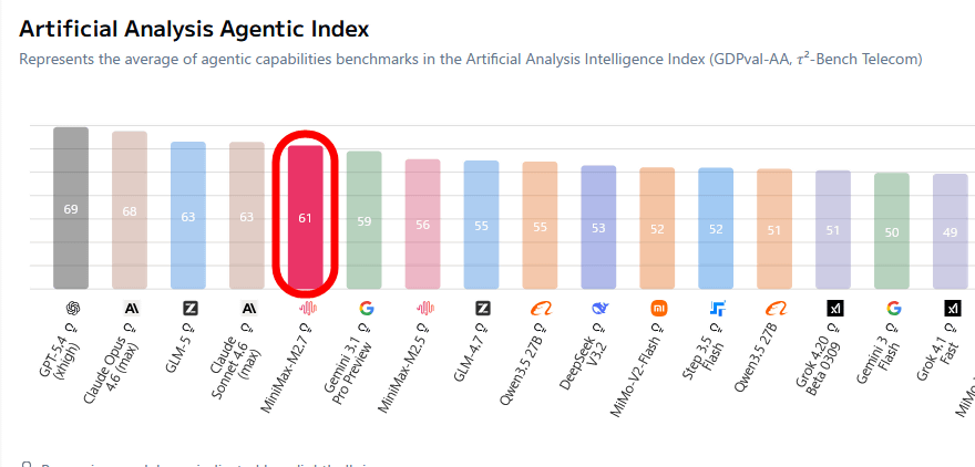 AIモデルの性能比較サイトであるArtificial AnalysisにもMiniMax M2.7のベンチマーク結果が掲載されています。エージェント性能を測定するテストではMiniMax M2.7がGemini 3.1 Pro Previewを上回り、Claude Sonnet 4.6に迫るスコアを記録しました。