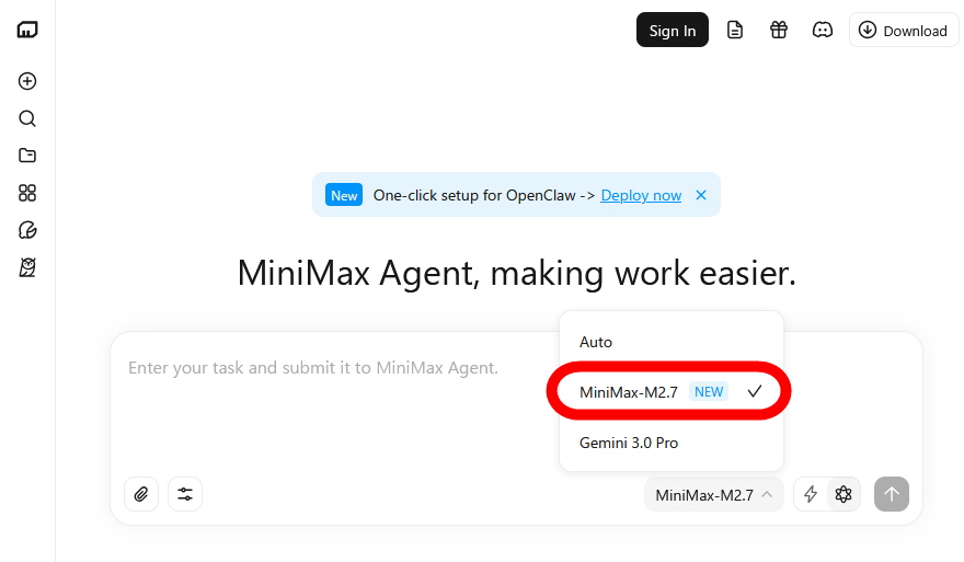MiniMax M2.7はチャットAIのMiniMax Agentで使用可能になっています。